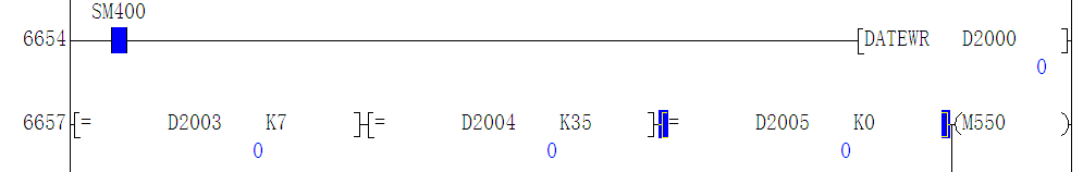請問 下這段程序怎么在PLC當(dāng)前時間7點鐘不能顯示出來D2003=7呢?是我程序?qū)戝e了嗎,請高手指點下,謝謝!