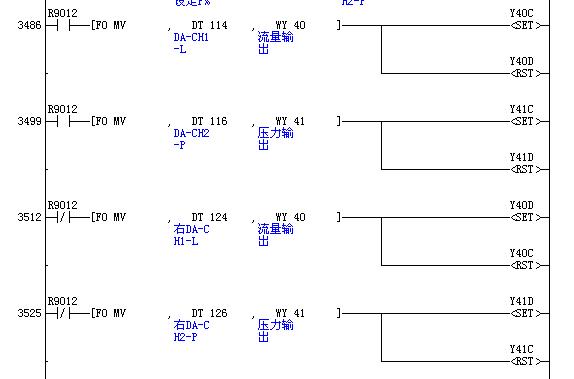 對FP0-A04V擴(kuò)展,如果安放在PLC右側(cè)第一個(gè)擴(kuò)展位,CH0,CH2是WY2。 CH1,CH3是WY3 要輸出到CH0,則對Y2C 置 1,對 Y2D 置 0 要輸出到CH2,則對Y2C 置 0,對 Y2D 置 1 另外 A04V D/A模塊下部有24V電源插座,要接24V 電源。 如對CH0輸出,程序應(yīng)寫成 R10-------(F0 MV K3000 WY2)---set Y2C | ---rst Y2D |