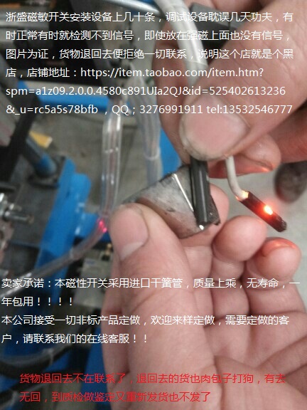 安裝設(shè)備需要,從**寶浙盛精品啟動(dòng)液壓,購買幾十條磁敏開關(guān),安裝到設(shè)備調(diào)試耽誤幾天時(shí)間,后安裝其他開關(guān)問題發(fā)現(xiàn)磁敏開關(guān)質(zhì)量問題,即便把開關(guān)放在強(qiáng)磁上面有時(shí)也不會(huì)有任何信號(hào),和客服聯(lián)系讓退回看看,退回去簽收以后不在回復(fù)任何信息,以剪線為名拒絕退貨(注:還有沒剪線的),買來開關(guān)是用的,不是看的,不安裝機(jī)器設(shè)備上面怎么能知道質(zhì)量有問題,難道在一條一條的把整臺(tái)設(shè)備都拆掉,各位有什么好的建議,到什么地方鑒定商品是假冒偽劣