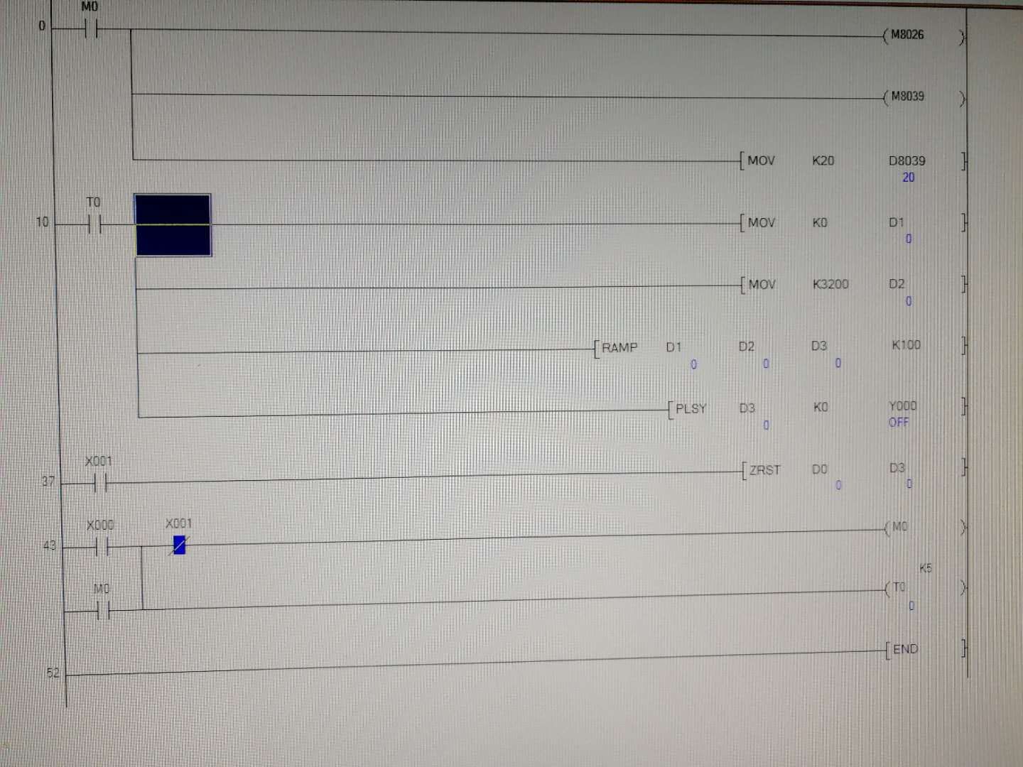 大家幫忙瞧瞧,我這個程序PLC上電之后第一次閉合X0運行正常等我降X1接通后重置,再將X0閉合,D3就直接跳到3200了!步進電機也因為頻率過高不會轉了,一直在發出異響?墒侵vPLC打到stop再打到run,第一次運行也正常,到了第二次又不行。試了一個晚上了???!新手剛學,? 希望有大神解讀一下,感激不盡!