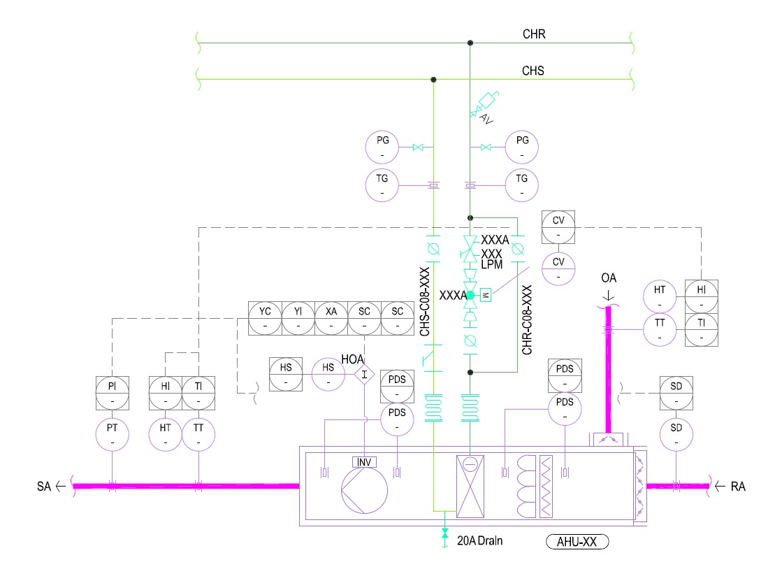 請教各位前輩控制圖檔和文字說明大概是這樣 請問前輩是否有類似的程序可以參考呢? 空調箱控制說明: 1. 回風溫度值TI感測需求溫度,以控制風機變頻器輸出維持回風溫度恒定;當溫度達到設定值時,維持最小換氣風量所需要的風車運轉頻率。 2. 出風溫度值TI感測需求溫度,以控制冰水二通閥CV開度,維持出風回風的溫度恒定。 3. 初級濾網建議每月定期更換,濾網差壓開關PDS調整至濾網必須更換裝態,當其作動時發出警報通知人員更換初濾及袋式過濾網。 4. 風差壓開關AFS,感測風機進出兩測的差壓狀態,當風機啟動后AFS未作動,則發出警報,通知人員檢修。 5. 風機停止或故障時,CV強制開閉以節約能源。 6. 當回風偵煙感測器SD偵測到煙霧時,會停止空調箱的運作,同時發出警報 圖示在附件中 圖片 |