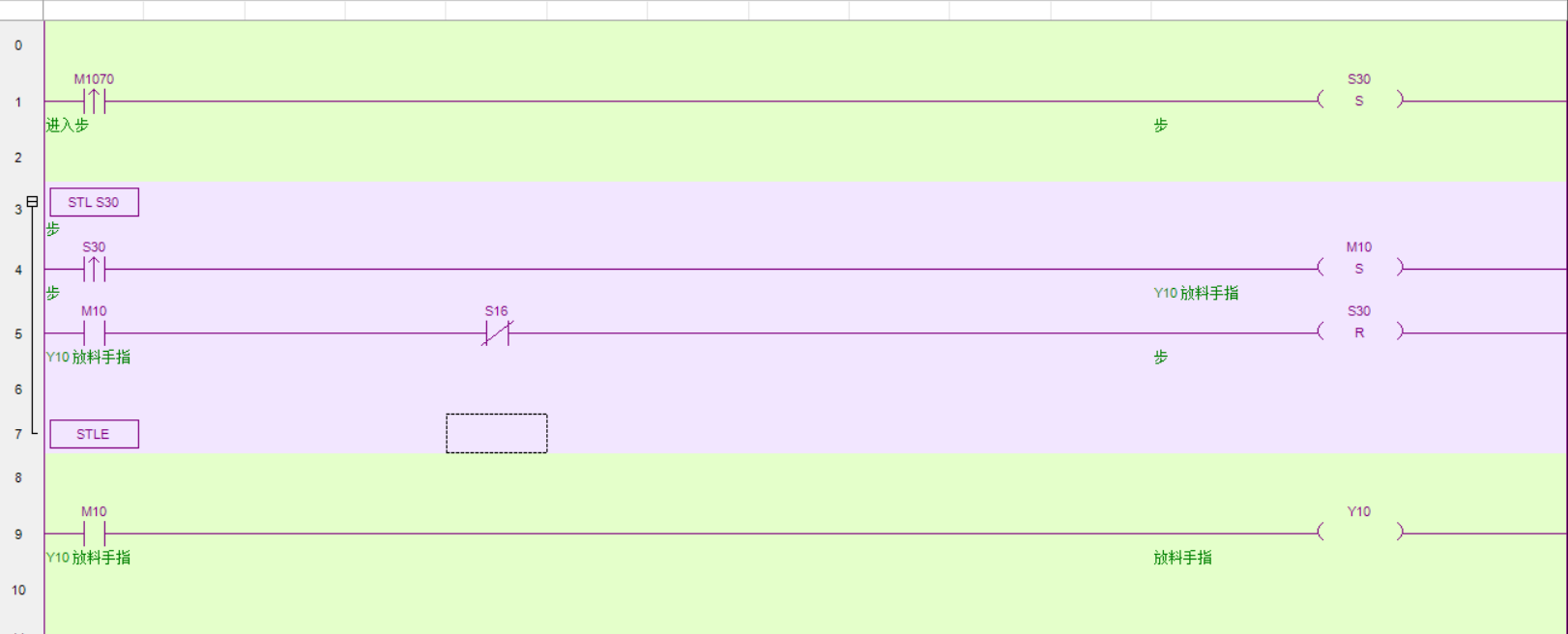 這個很好理解啊,你看一下先后順序就行了。你先SET S30,S30接通瞬間是有一個上升沿,可是你有沒有發現,S30的上升沿是在S30的步里面,步里面的程序要步接通以后才能運行,所以就SET不了M10。你可以在步里面LD S30    TMR  T30 K1 K10(用一個延時讓它們的邏輯先后順序分明),然后LD T30 SET M10    RST S30。這樣百分之百不會有問題