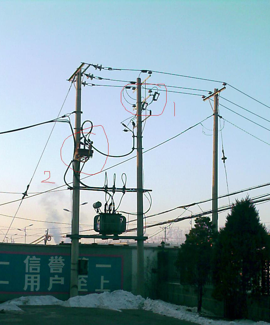 呵呵呵呵呵。。避雷器在跌落開關的下面就是。每個避雷器只接了一根線的。地球人都知道。 |