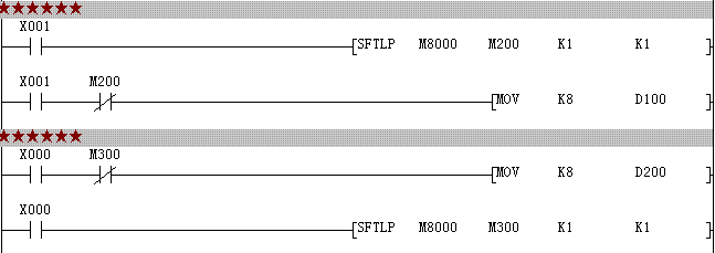 3.就這幾行程序來看,X001接通后,D100不等于8,D200等于8 。