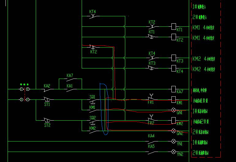合時(即電機1#故障時),KA4常開觸點要使KM2接觸器吸合(即電機2#啟動,當然此時KA5常開觸點不能閉
