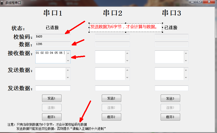 分享一個本人自己做的多串口調試軟件,支持3個串口同時測試,自動計算消息頻為6個字節的16位校驗碼,同時計算出第5以及第6字節的數據大小。
