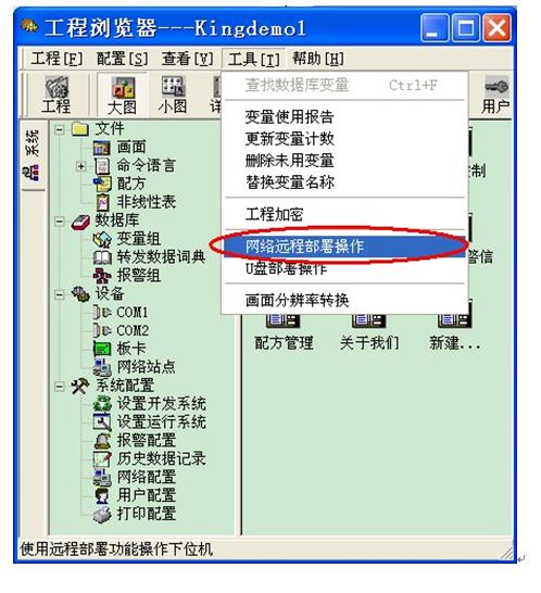 打開上圖選中的工程(組態王提供的演示工程)。在工具菜單中選擇“網絡遠程部署操作”。