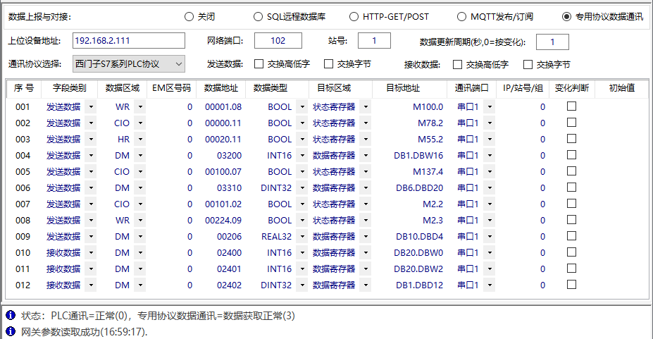 端口參數(shù)設(shè)置完成后下載重啟才會生效,另外串口連接PLC還可以用‘單站協(xié)議匹配’功能自動搜索出PLC,網(wǎng)絡(luò)檢查可以用‘執(zhí)行PING’。PLC連接和網(wǎng)絡(luò)確認(rèn)后就可配置數(shù)據(jù)表了,通過‘功能’->‘?dāng)?shù)據(jù)上報與平臺對接’進入數(shù)據(jù)上報與平臺對接頁面,選擇‘專用協(xié)議數(shù)據(jù)通訊’的數(shù)據(jù)配置表,下圖是配置的部分參數(shù),通過底部的狀態(tài)消息可以看出數(shù)據(jù)交互是正常的。
