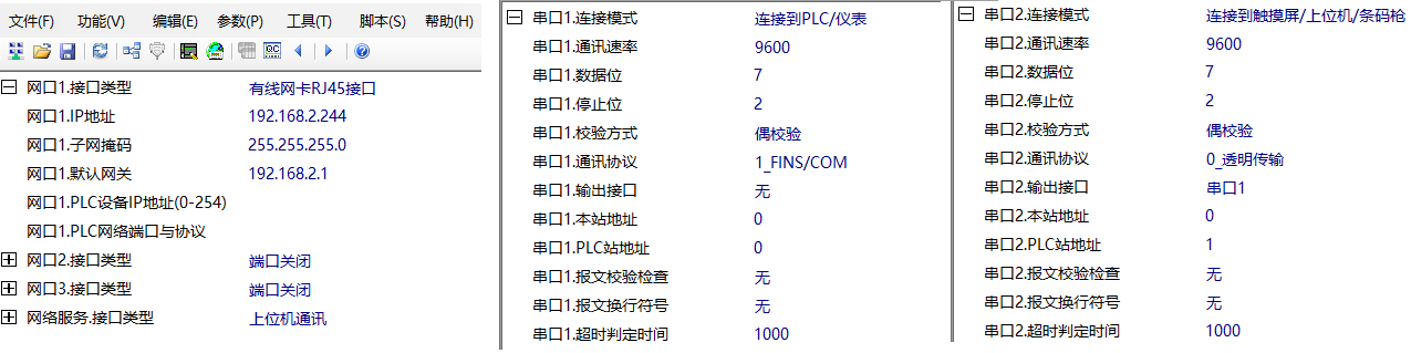 智能網(wǎng)關(guān)的串口1接歐姆龍PLC,串口2接觸摸屏;通過網(wǎng)口對接西門子S7-1500的PLC(IP地址:192.168.2.111)。打開智能網(wǎng)關(guān)的參數(shù)設(shè)置軟件(軟件下載),先設(shè)置智能網(wǎng)關(guān)模塊的網(wǎng)口和串口參數(shù),設(shè)置好的參數(shù)如下圖: