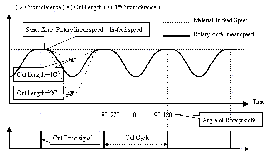 2. 經過PDS-RC控制系統精確的計算、控制,在「裁刀速度」上升到一定值之後,立刻開始減速;務求在「裁刀速度」下降到與「進料速度」同步的同時,「裁切刀輪」也恰好進入「同步區域」;並維持同步直到第二個「裁切點」出現,乃完成一次「裁切循環」。