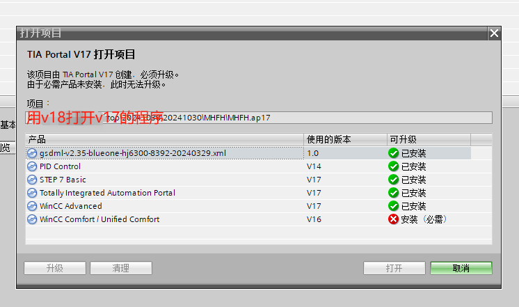 用博途v18專業(yè)版打開v17程序,提示缺少wincc  安裝包 見圖  求教該下載哪個(gè)安裝包。在官網(wǎng)下載了一個(gè) 圖2  但是沒法安裝