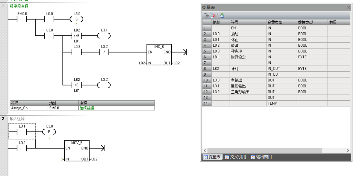 smart200做一個帶參星三角子程序,調用兩次。I0.0啟動時,兩個子程序都會有輸出。實在想不出哪個地方做的不對,請師傅們幫我看一下,錯誤在哪兒?! |