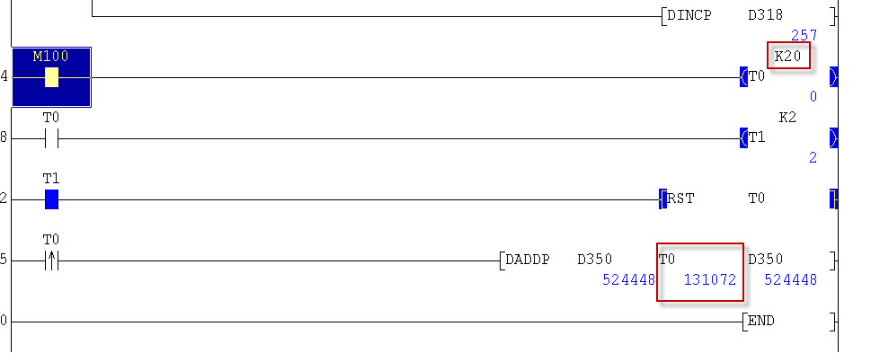 4,將T0上升沿后做加法運(yùn)算這一句緊放在T0輸出線圈這一句后面可以避免這種情況;T0輸出線圈這一句放在RST T0這段后面更好。