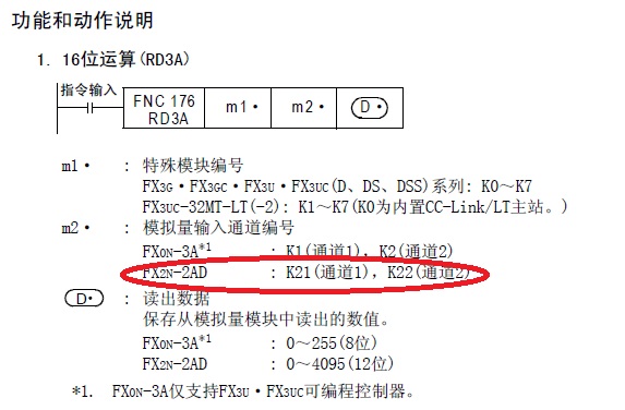 我司有個設備的程序,里面有一段程序是RD3A K0 K21 D0,我查了手冊應該是RD3A K0 K1 D0或者RD3A K0 K2 D0,其中的K1或者K2模擬量輸入通道號。 模擬量模塊FX2N-2AD只有2個通道,按說前面這個指令中的K21應該是錯誤,但程序可以讀出,問一下網友這是怎么回事? |