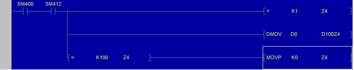 案例,FX3Gplc+FX2N-2ad,接收一個模擬量信號,想得到它在一秒內變化的數據,最少要有100個數據,就是將一個變化的數傳送到100個不同的地址里,第一種方法用計數器,10ms時鐘計數,理論上有100個數據,但程序太長。然后我就寫了一段變址程序,但并沒有將數據傳到這個地址里去,請大神幫忙看看程序!!!