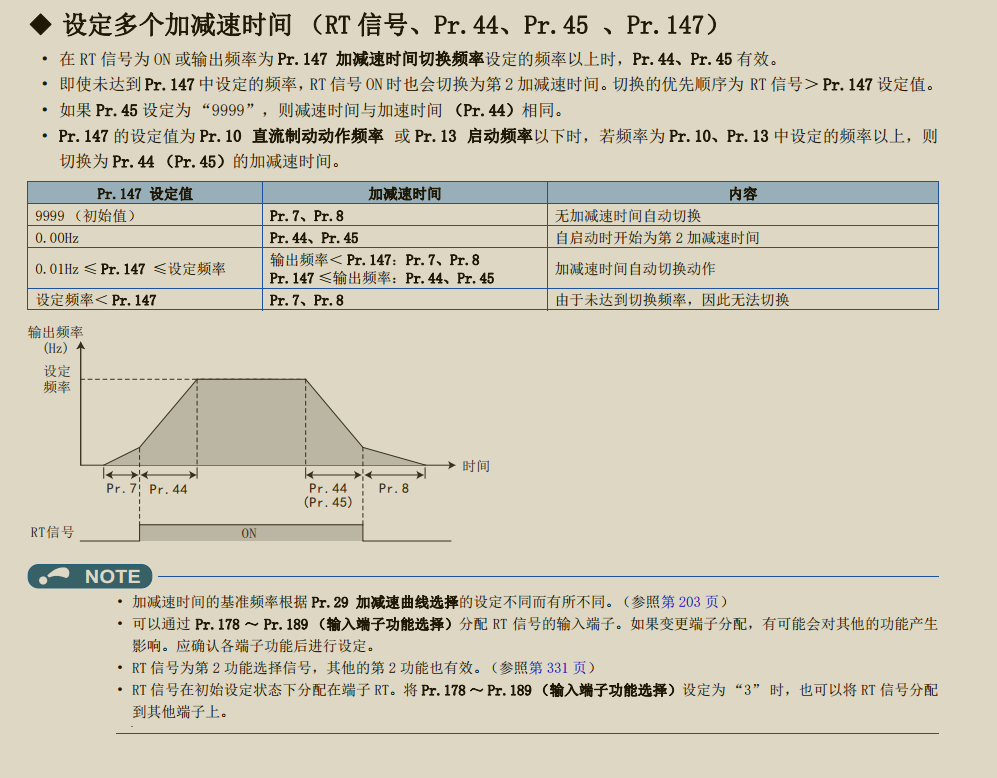 目前只在說明書中找到“設定多個加減速時間”,但是好像需要一個(RT)信號輸入到變頻器。
