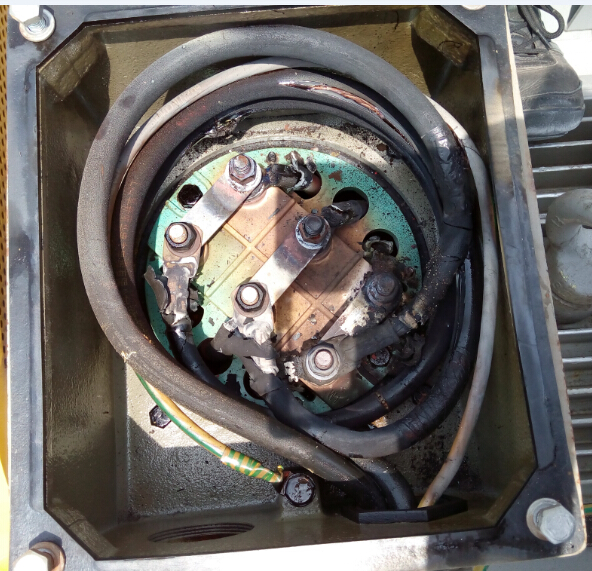 各位大俠,請(qǐng)看圖。馬達(dá)功率200HP,380V,50HZ。接線時(shí)在里面繞了一圈,在使用大概2個(gè)多月后出現(xiàn)變頻器警報(bào)。后來(lái)拆蓋檢查,發(fā)現(xiàn)接線柱已經(jīng)全部燒掉,電纜繞圈這部分也燒毀。