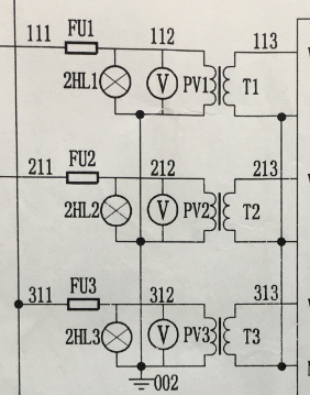 首先,111,211,311線電壓是380v的話,那相電壓111與002之間的電壓就是220v(211,311與002之間一樣),其中在111與002之間并聯了一個指示燈加一個電壓表作為顯示與缺相報警。其中002一般是n線,當然要看你工廠進線是3相4線還是3相5線了。后面的t1,t2,t3這三個變壓器按圖正常接就行。 ,如有錯誤,請各位大佬指正......