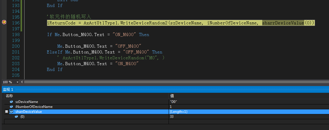 iReturnCode = AxActUtlType1.WriteDeviceRandom2(szDeviceName, iNumberOfDeviceName, sharrDeviceValue(0))