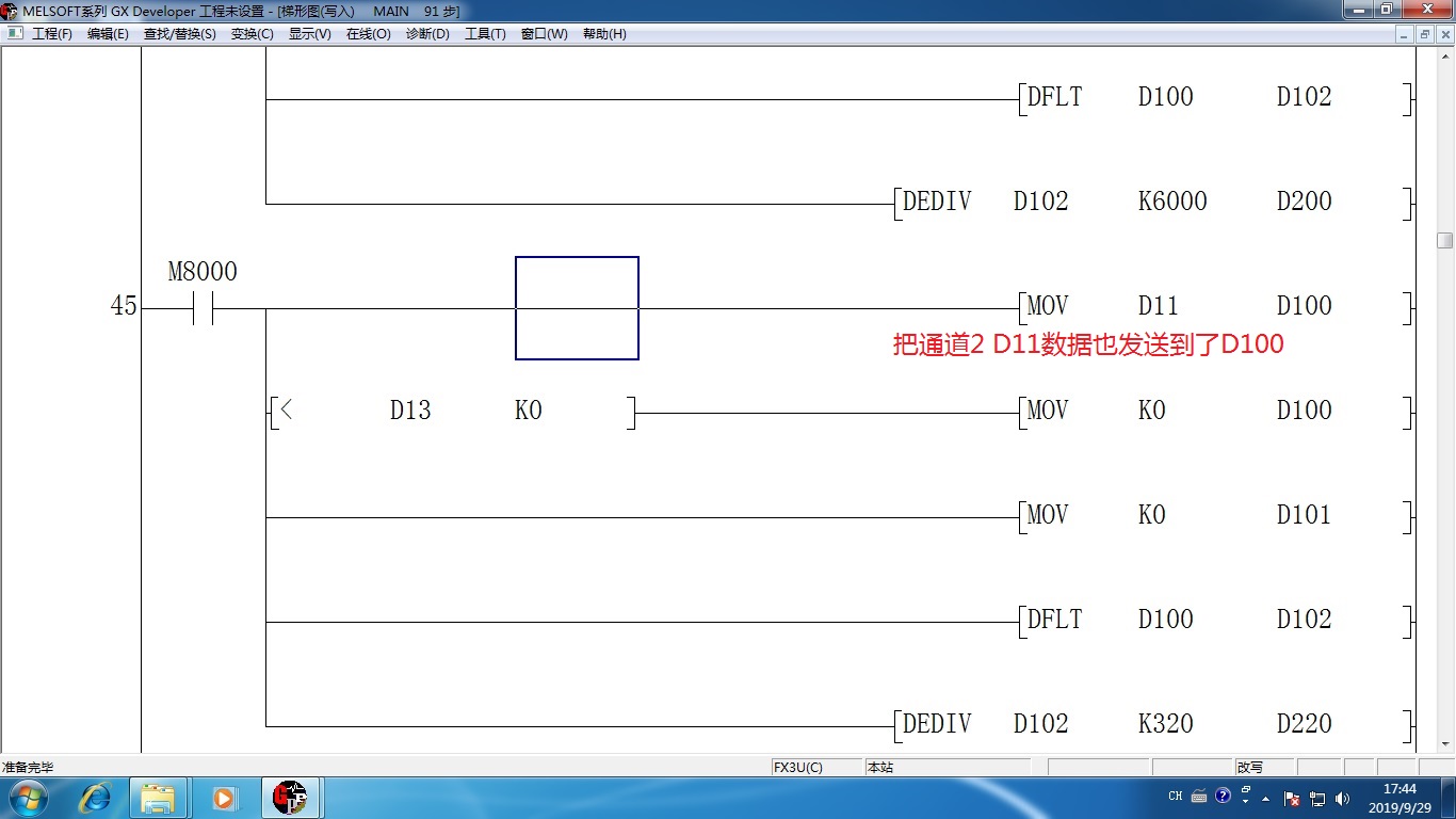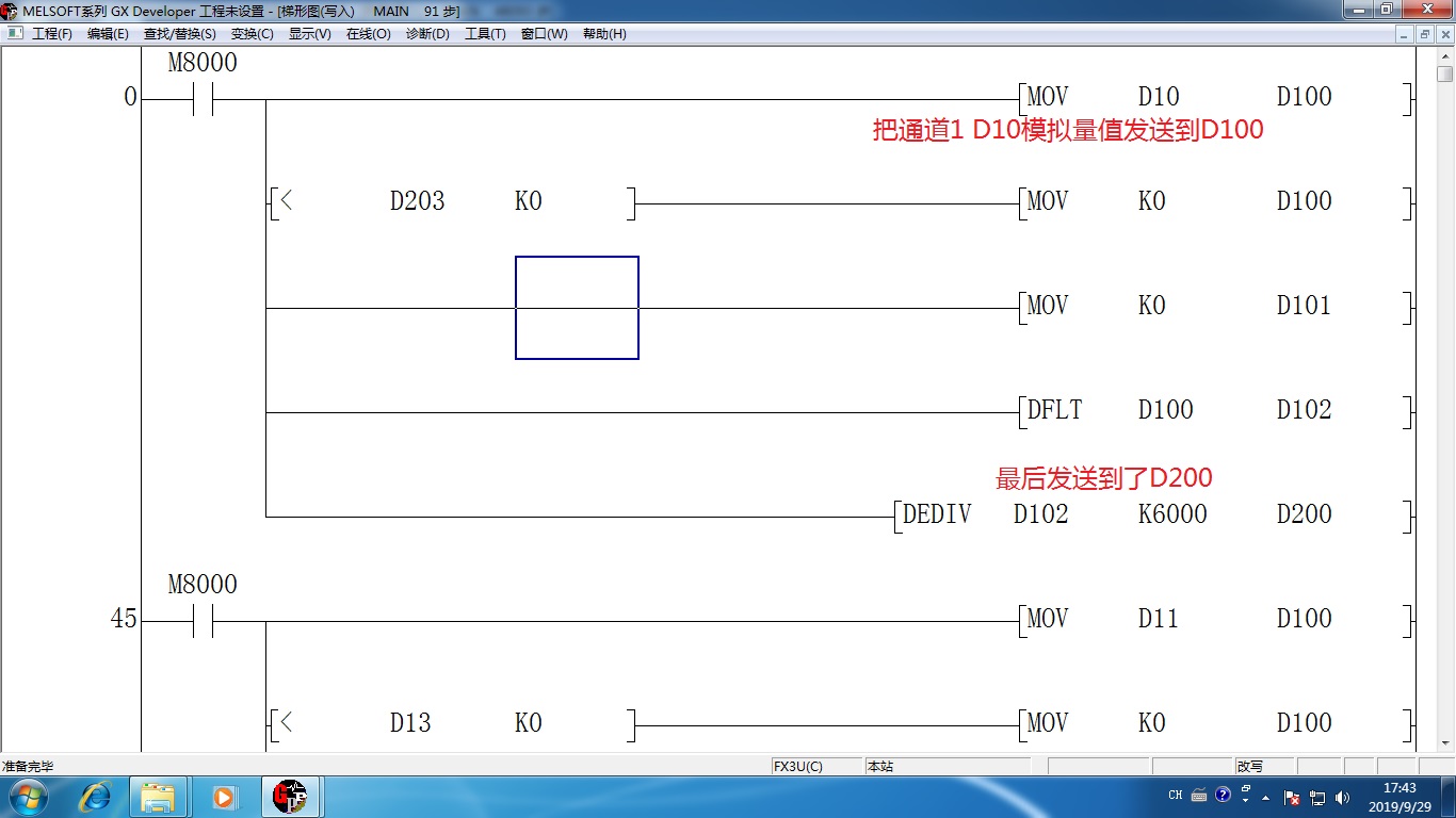 用M8000時(shí),每次掃描時(shí)就把D100的數(shù)據(jù)更新了,如果D203大于K0時(shí),又被清零了,接著D100的數(shù)據(jù)在實(shí)際編程中有實(shí)際意義嗎?但是作為編程軟件來(lái)說(shuō)無(wú)可厚非,在實(shí)際項(xiàng)目中,意義未知