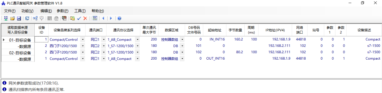 上表中設(shè)備ID是每臺PLC設(shè)備的號碼,可在1~254之間自由分配;DB號碼/文件號碼參數(shù)里AB的PLC對應(yīng)數(shù)組內(nèi)的起始地址,支持多維數(shù)組,比如二維數(shù)據(jù)格式為0,0;起始地址參數(shù)里AB的PLC對應(yīng)數(shù)組名稱,或者變量名稱,須要與PLC內(nèi)的名稱完全一致;字節(jié)數(shù)量設(shè)置交互的字節(jié)數(shù)據(jù),只需設(shè)置目標(biāo)設(shè)備的數(shù)量,上圖中的160,2表示160個字節(jié),PLC內(nèi)存為2字節(jié)數(shù)據(jù),如果PLC的數(shù)組數(shù)據(jù)類型是DINT,則設(shè)置為160,4;網(wǎng)絡(luò)端口參數(shù)AB的是44818,S7的是102;更詳細(xì)的參數(shù)介紹查看網(wǎng)關(guān)的手冊第6章(用戶手冊下載地址)。