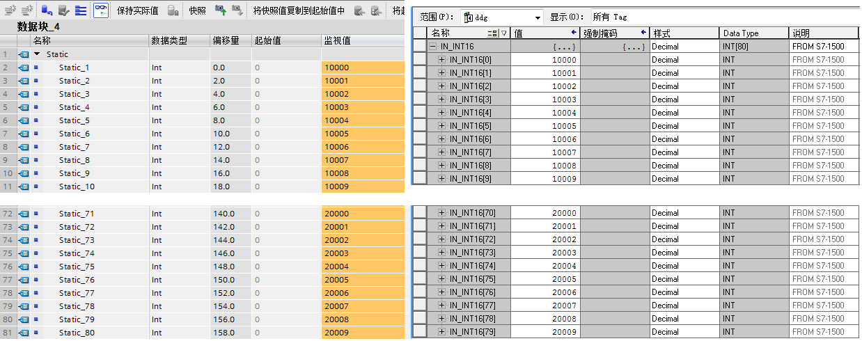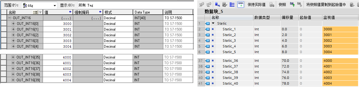 可以看到數(shù)值都能對應(yīng)上,然后同樣的方法測試從AB的PLC到S7的數(shù)據(jù),在OUT_INT16數(shù)組的前5個和最后5個設(shè)置上數(shù)據(jù),然后通過博圖軟件監(jiān)視,如下圖: