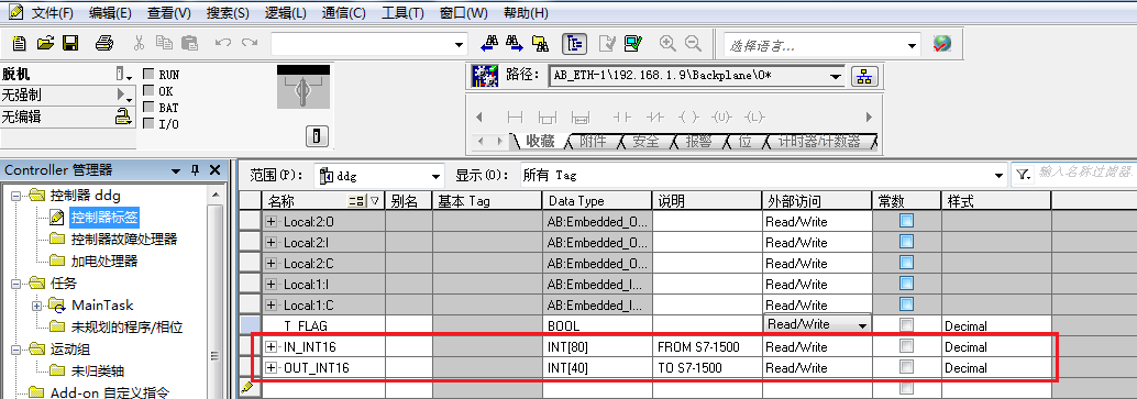 首先在AB的PLC內(nèi)建立輸入和輸出數(shù)組,用于接收和寫入S7-1500的PLC數(shù)據(jù),名稱分別是IN_INT16、OUT_OUT16,輸入80個字即160個字節(jié),輸出40個字即80個字節(jié),類型都為INT,如下圖,注意新建立的數(shù)組須要下載后重啟PLC才會生效。