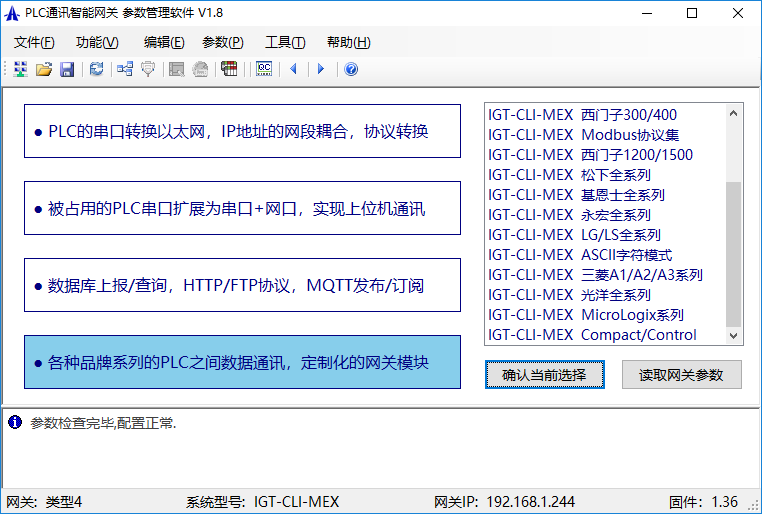 然后開始配置網(wǎng)關(guān),通過網(wǎng)關(guān)的參數(shù)設(shè)置軟件(下載地址)搜索到網(wǎng)關(guān)模塊后,讀取默認(rèn)參數(shù),在'功能'->‘類型與設(shè)備選擇’頁面的4種類型選擇最下面一項,點'確認(rèn)當(dāng)前選擇'按鈕,切換為類型4,系統(tǒng)為IGT-CLI-MEX,即多設(shè)備數(shù)據(jù)交互模式,如下圖,然后下載重啟: