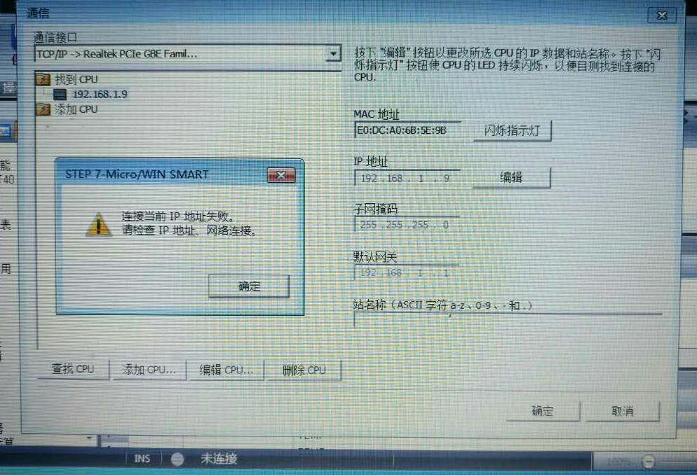 200smatr網口硬件連好,plc link燈點亮,編程軟件中查找到cpu ip地址192.168.1.9 點閃爍指示燈plc燈閃爍,ip地址 子網 默認網關都設置好了, 點擊“確認” 彈出“連接當前ip地址失敗。請檢查ip地址、網絡連接”。不知問題出在哪里?筆記本電腦。 請各位大俠幫忙指點一下,謝謝! |