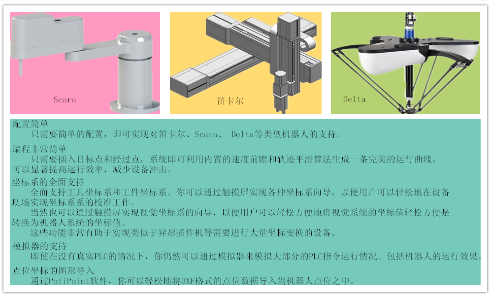 Ø  PoliPLC F101提供了各種常見結構的四軸以下機器人的支持。對于大多數類型的四軸以下的機器人,我們都提供了靈活的支持方式。這樣可以解決單純的位置控制難以解決的問題,例如軌跡規劃的問題。