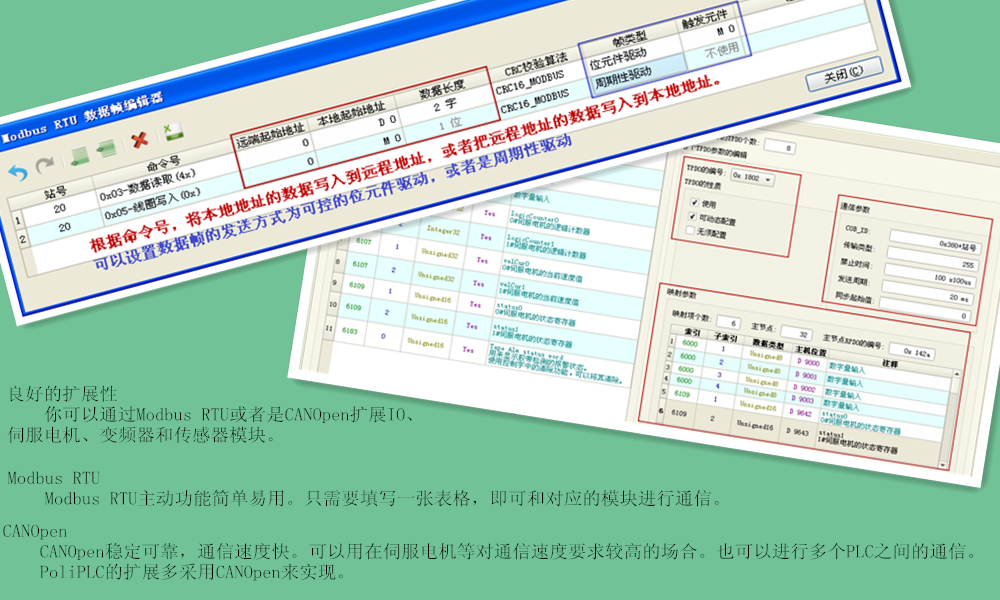 Ø  完善的Modbus通信支持。Modbus RTU從動協議可以連接觸摸屏,進行程序和設備的監控和操作;Modbus RTU主動協議可以用來連接遠程IO,變頻器等;Modbus TCP從動協議也可以用來連接觸摸屏,甚至可以實現遠程調試、遠程監控、遠程系統程序升級、固件升級等功能。如果你能夠編寫手機程序,甚至可以實現在手機上通過Modbus TCP對設備運行情況的監視;或者如果你能夠編寫電腦程序的話,也可以通過ModbusTCP讀取PoliPLC的運行數據連接到你公司的數據庫中,從而實現全面的數據管理。