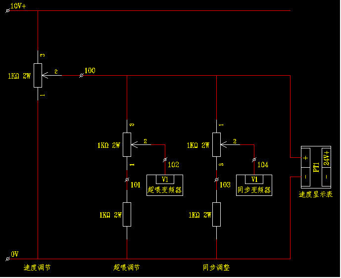 請看圖,第一個電位器為總的速度調(diào)節(jié).第二個超喂調(diào)節(jié),在反轉(zhuǎn)的時侯調(diào)至最低,防止反轉(zhuǎn)時同步變頻速度跟不上卡住布.第三個同步電位器安裝在張力桿上,起與主變頻速度作自動調(diào)節(jié)的作用.張力的大小控制可以用氣缸通過調(diào)節(jié)閥作調(diào)節(jié).