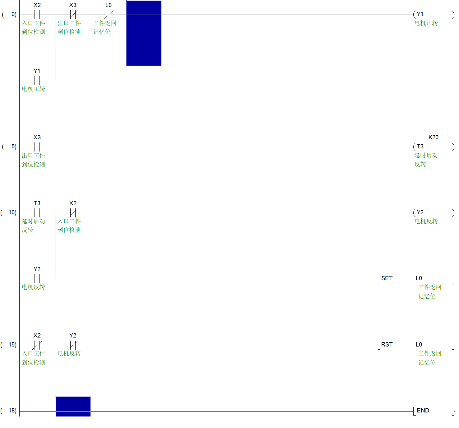 當(dāng)中,入口處感應(yīng)器,作為啟動條件,又作為反轉(zhuǎn)停止條件,如果運行中東西掉了,感應(yīng)不到,就無法停止反轉(zhuǎn)了,要穩(wěn)定可靠的工作,可能還要考慮限位、急停等條件。