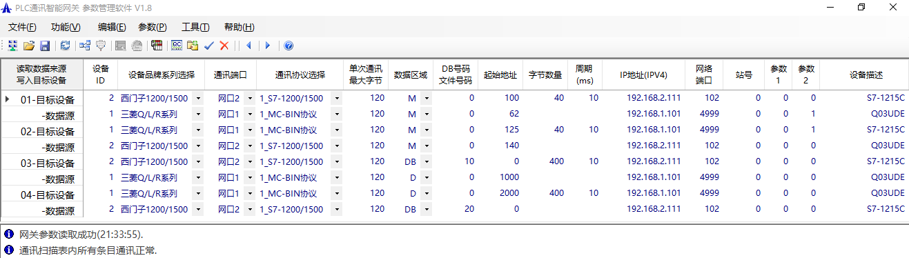 通過‘參數(shù)’->‘參數(shù)寫入到網(wǎng)關(guān)’將以上配置下載到網(wǎng)關(guān)模塊,然后通過‘工具’->‘重啟網(wǎng)關(guān)’重啟后,網(wǎng)關(guān)模塊即進(jìn)入工作狀態(tài),按照以上4個(gè)任務(wù)建立4個(gè)線程運(yùn)行。相關(guān)資料在附件中: