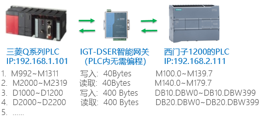 PLC通訊智能網(wǎng)關(guān)IGT-DSER支持各種PLC之間多對(duì)多通訊;PLC無需編程,只需配置寄存器地址,還帶有字節(jié)順序調(diào)整功能,方便快速實(shí)施;因?yàn)槭嵌嗑程的交互模式,所以可以保證高實(shí)時(shí)性;支持串口、網(wǎng)口通訊,以及WIFI、4G無線通訊。