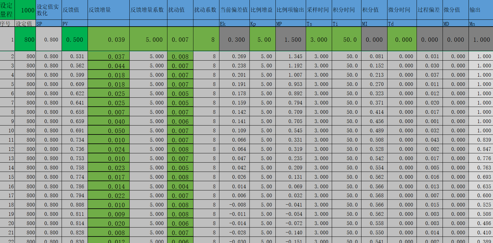 1.“設(shè)定量程“”為了方便設(shè)定值與反饋值換算為0-1的實(shí)數(shù);“設(shè)定值”為需要達(dá)到的目標(biāo);              2. “反饋增量”是為了模擬執(zhí)行機(jī)構(gòu)的輸出對(duì)反饋值得影響,設(shè)置越大作用越強(qiáng)越明顯;              3.“擾動(dòng)系數(shù)”是模擬實(shí)際應(yīng)用中外部變量對(duì)反饋值得影響,設(shè)置越大擾動(dòng)越強(qiáng)烈;