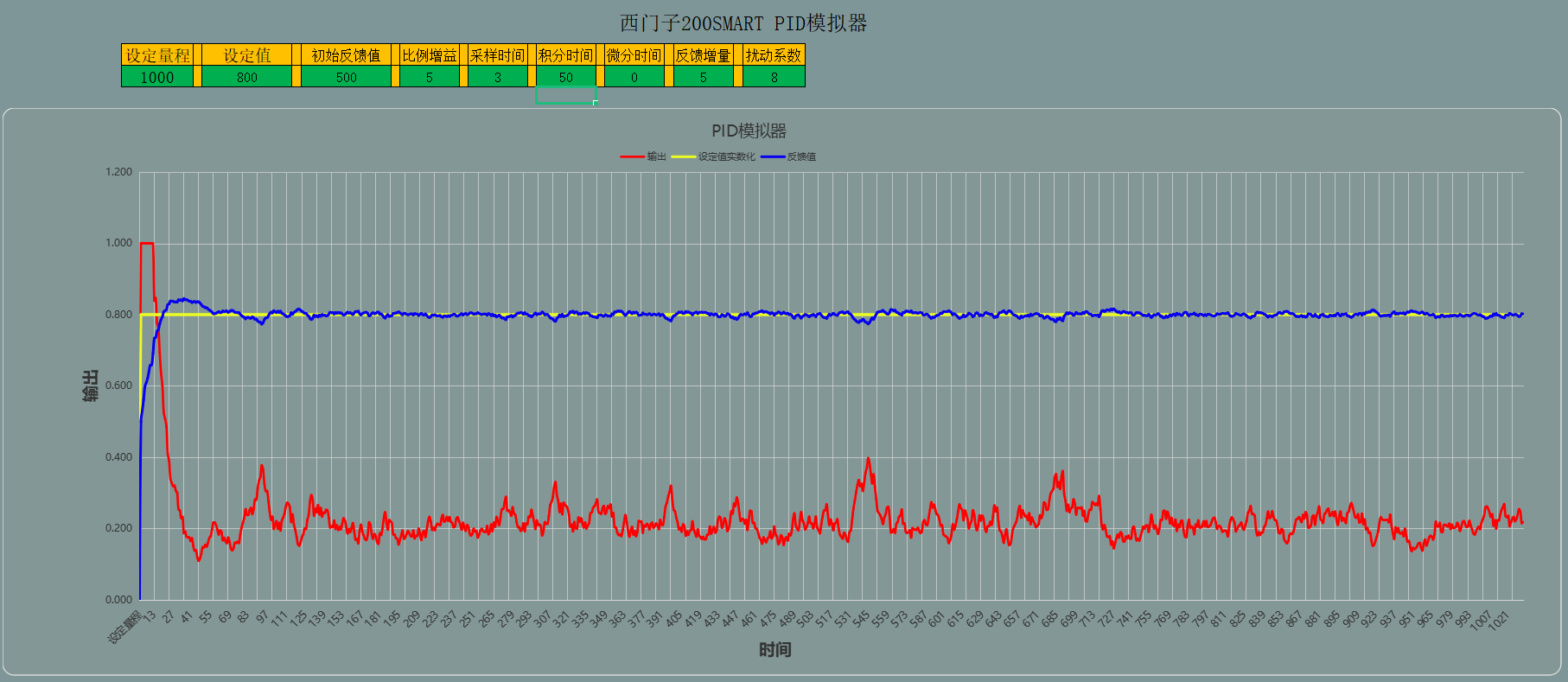 根據(jù)200smart的PID算法,可對(duì)擾動(dòng)值及輸出反饋增量進(jìn)行設(shè)置模擬各種工況,對(duì)200smart PID算法更深入了解。