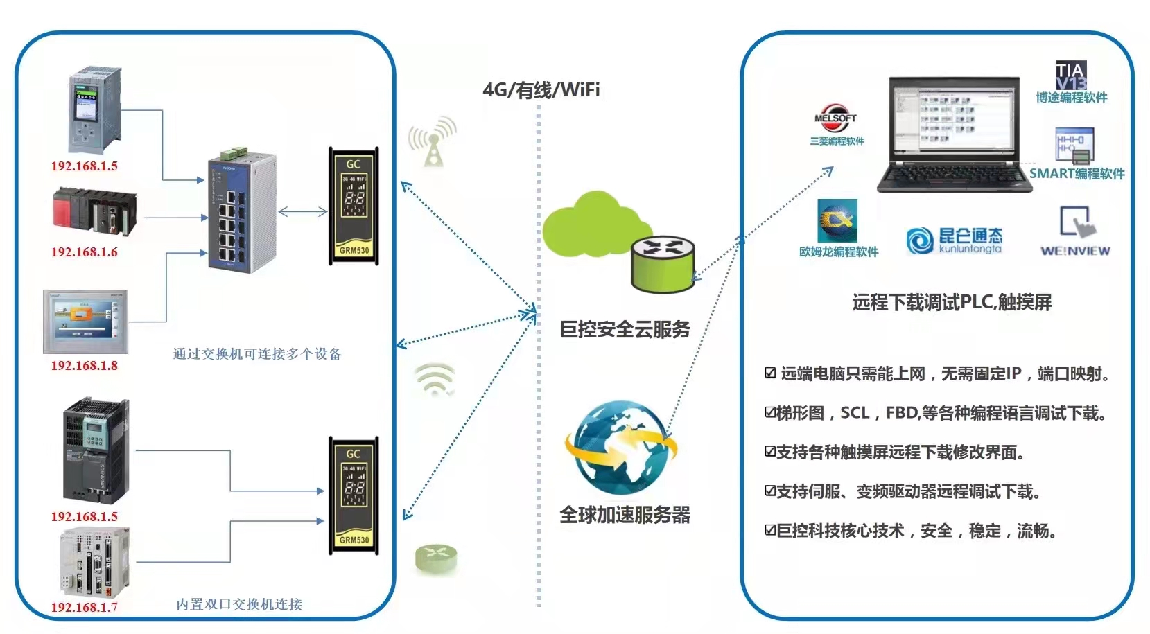 GRM530 是巨控科技專用于 PLC 遠程監(jiān)控和遠程維護的無線通訊模塊。 只需一個模塊即可實現(xiàn)觸摸屏遠程下載、 PLC 遠程調試、 上下載梯形圖、 組態(tài)軟件遠程監(jiān)控、 短信報警提醒、