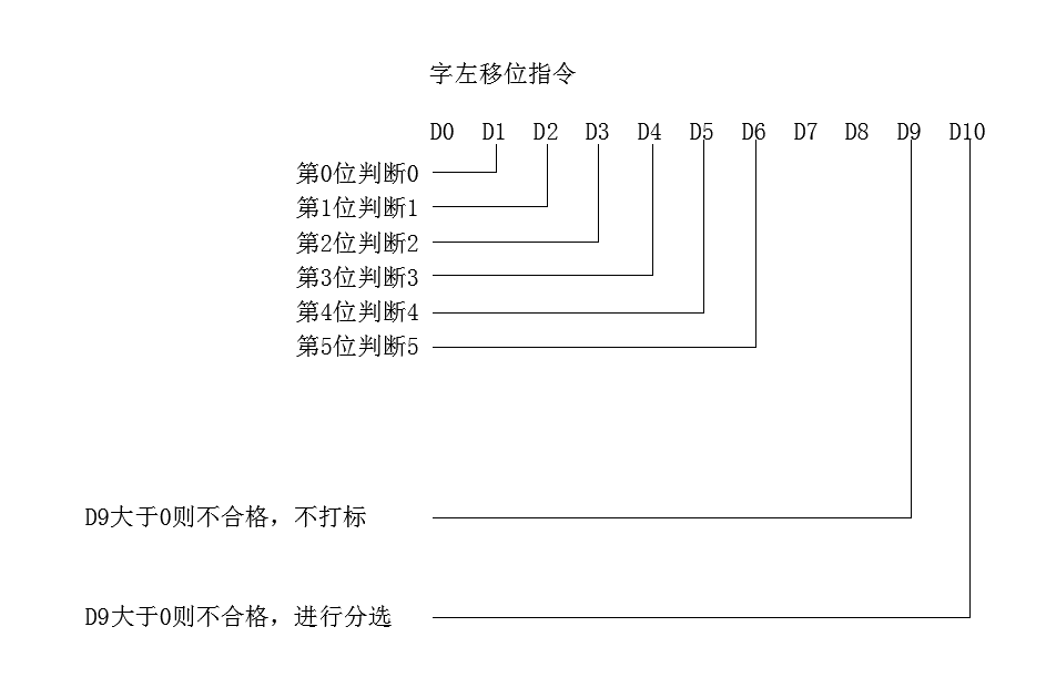 第一個寄存器,D0,D1……D11,哪一個工位不合格就置位,比如D1不合格,那么就D1,0等于1,第3工位不合格,那D2.1等于1,工位有沒有料靠M0到11來做,最后判斷的時候,D10大于0的時候,就是不合格……