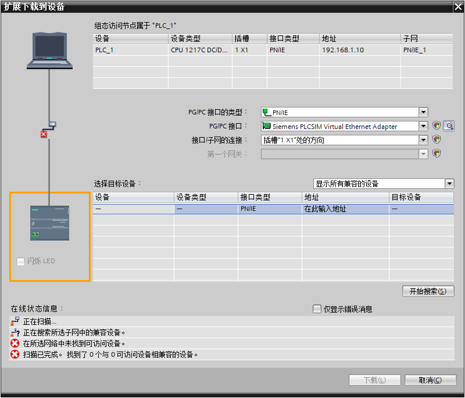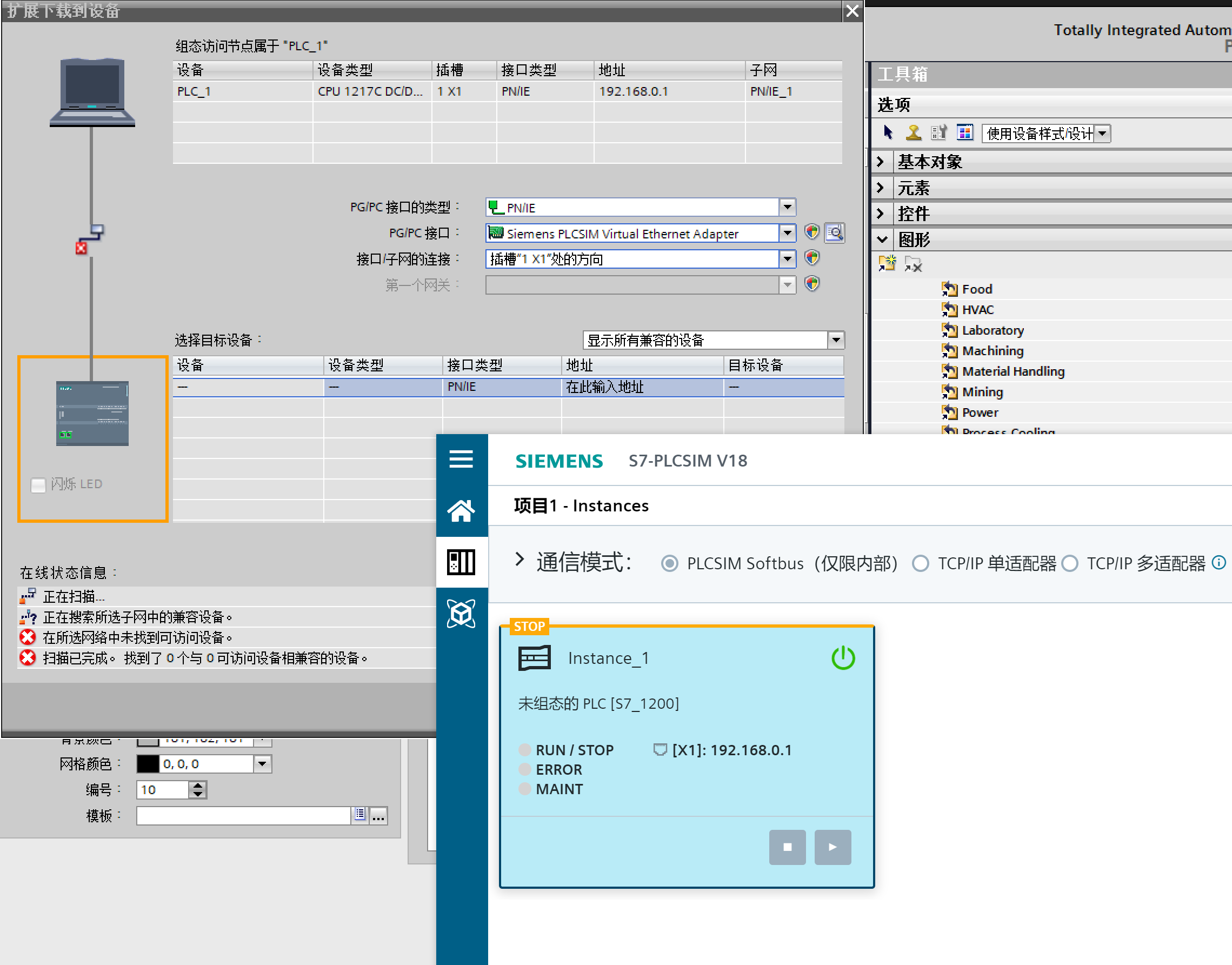 V18博途軟件,S7-1200PLC,KTP1200觸摸屏,屏可以正常仿真,PLC仿真下載時找不到可訪問設備,PLC和屏在線連接下載都正常。殺毒軟件關了,防火墻也關了,還是不行。有哪位老師了解的指導一下,謝謝!