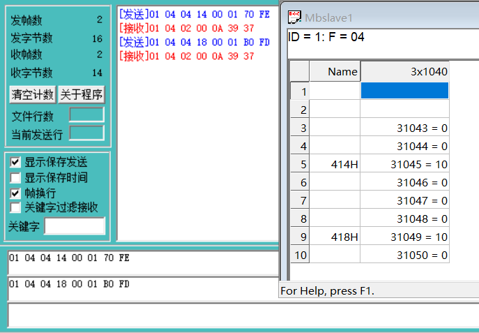 03讀  [發(fā)送]01 03 04 14 00 01 C5 3E  [接收]01 03 02 00 0A 38 43