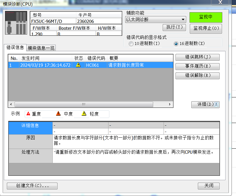 各位,新手小白在按照SLMP通訊手冊上的范例和上位機通訊時一直有個HC061報警,搞了一天不知道究竟哪里的問題。還請大神指導一下,萬分感謝!
