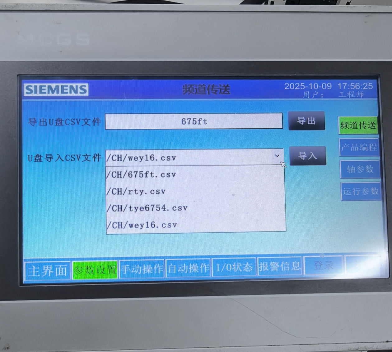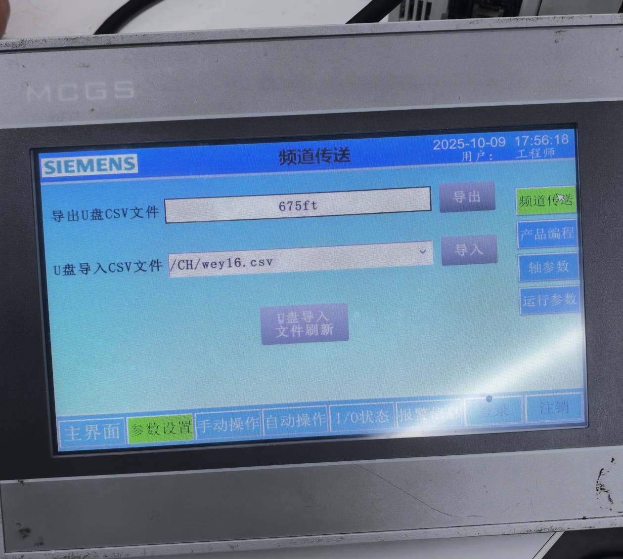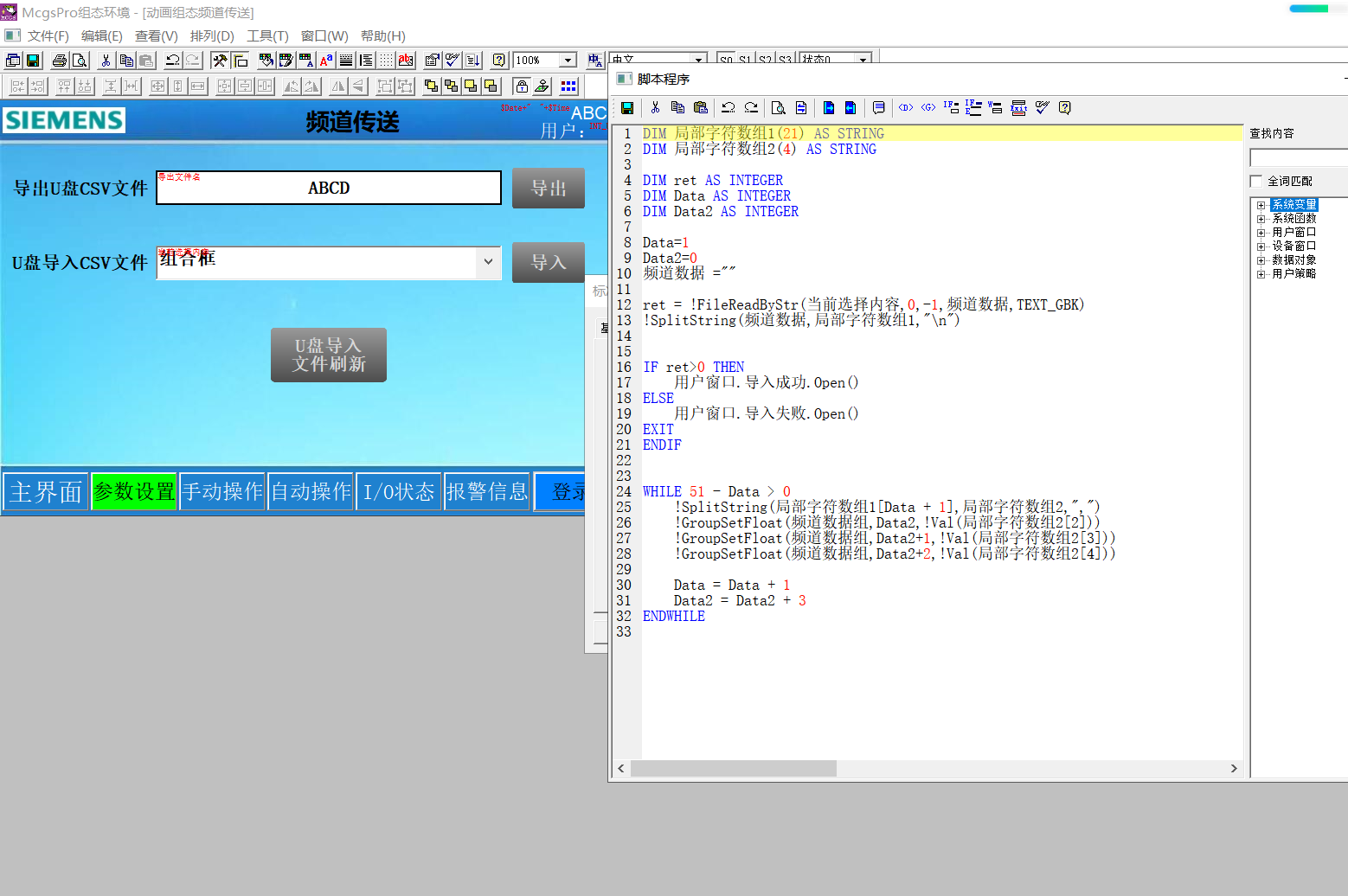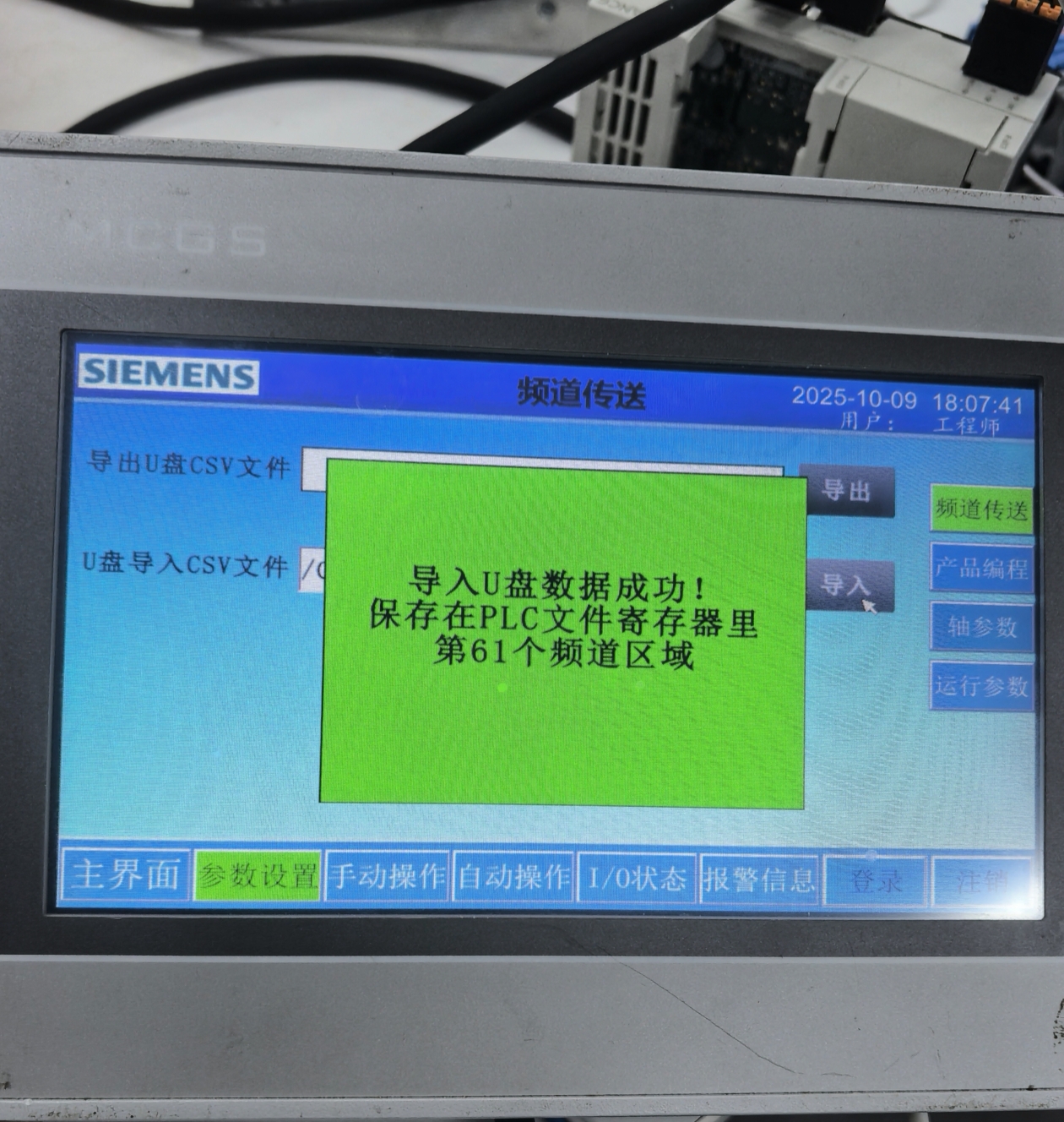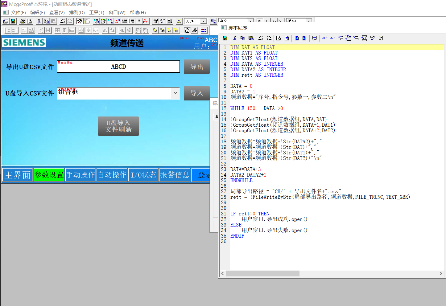 MCGS觸摸屏寫腳本,用U盤導(dǎo)入導(dǎo)出CSV文件,可以把U盤CSV里頻道數(shù)據(jù)直接導(dǎo)入到PLC頻道里,也可以把PLC頻道指令參數(shù)導(dǎo)入到U盤CSV里。用CAD提取產(chǎn)品坐標(biāo)點(diǎn)生成指令參數(shù)CSV文件,導(dǎo)入觸摸屏PLC,一次可以導(dǎo)入500到10000個(gè)參數(shù)給PLC,做成小數(shù)控系統(tǒng)運(yùn)行動(dòng)作。 觸摸屏用腳本寫U盤導(dǎo)入導(dǎo)出csv文件到PLC,比配方有優(yōu)勢,傳輸數(shù)據(jù)量大,操作方便。 [ 此帖被hezhen880924在2025-10-11 17:32重新編輯 ] |
