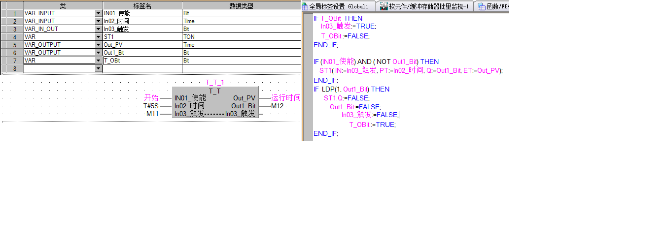Timer_T (IN:=Int2_開始,PT:=Int7_間隔時間,Q:=T_ON,ET:=Out_當前點亮時間) ;