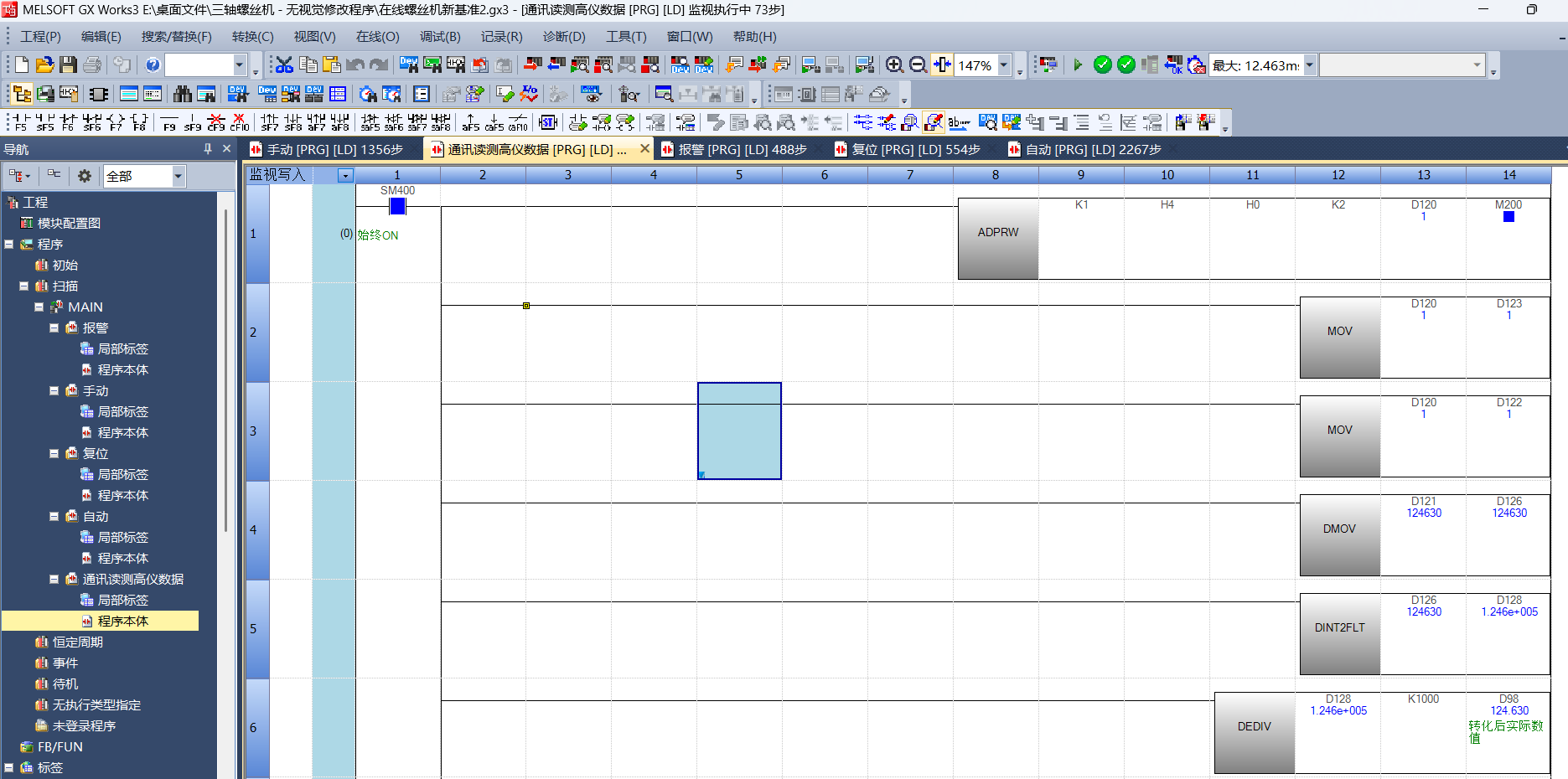 - **`DEDIV`** :是 32 位浮點數除法指令 。`DEDIV D128 K1000 D88` 就是用 `D128 - D129` 里的浮點數(比如轉換后的 `1.246e + 005`  )除以 `1000` ,結果存到 `D88 - D89` 里(`D88` 顯示 “轉化后實際數值”  ),可能是為了把原始數據換算成實際物理量(比如測高儀原始計數換算成毫米、米等實際長度 )。