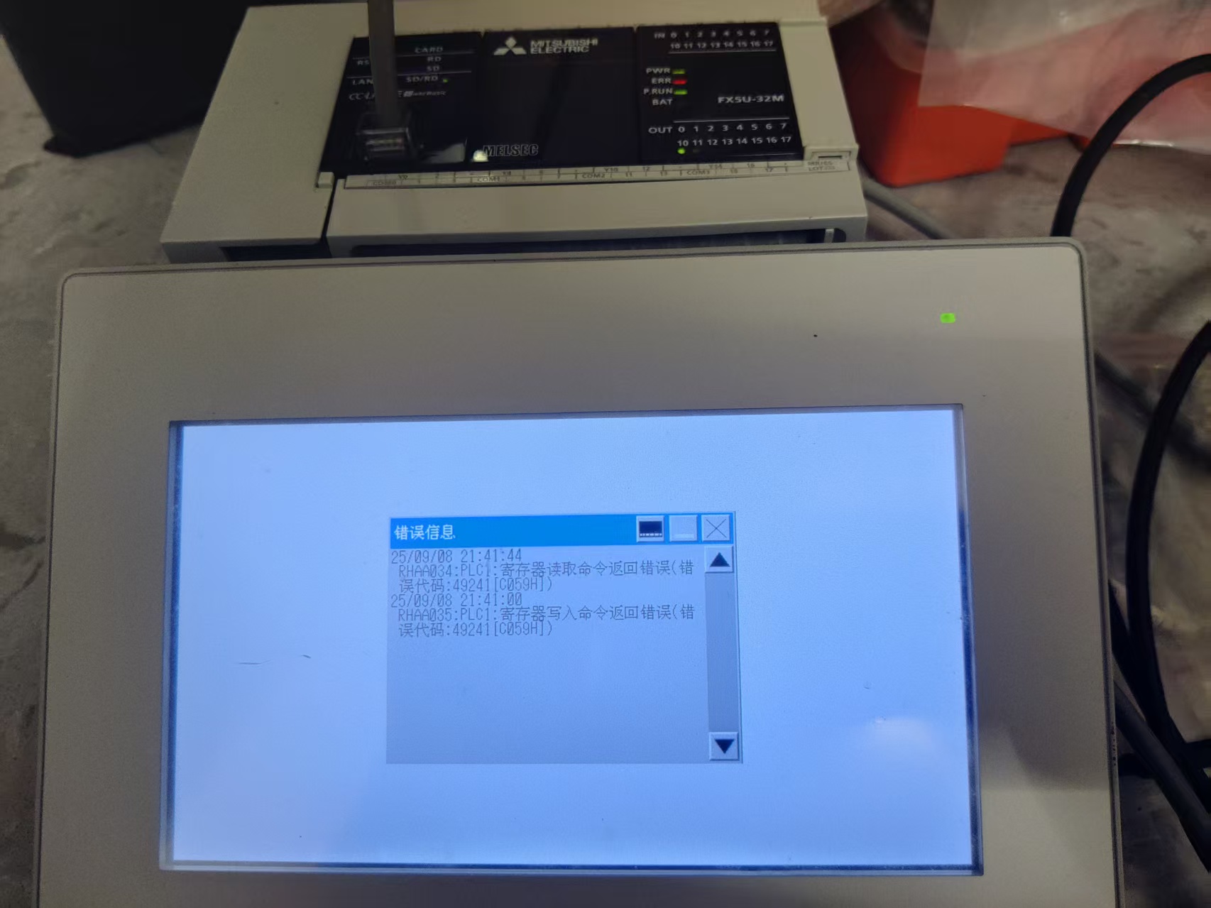 有臺GP-4402WW與FX5U,下載新建的人機程式,與5U 一聯線,PLC報警ERR燈常亮。