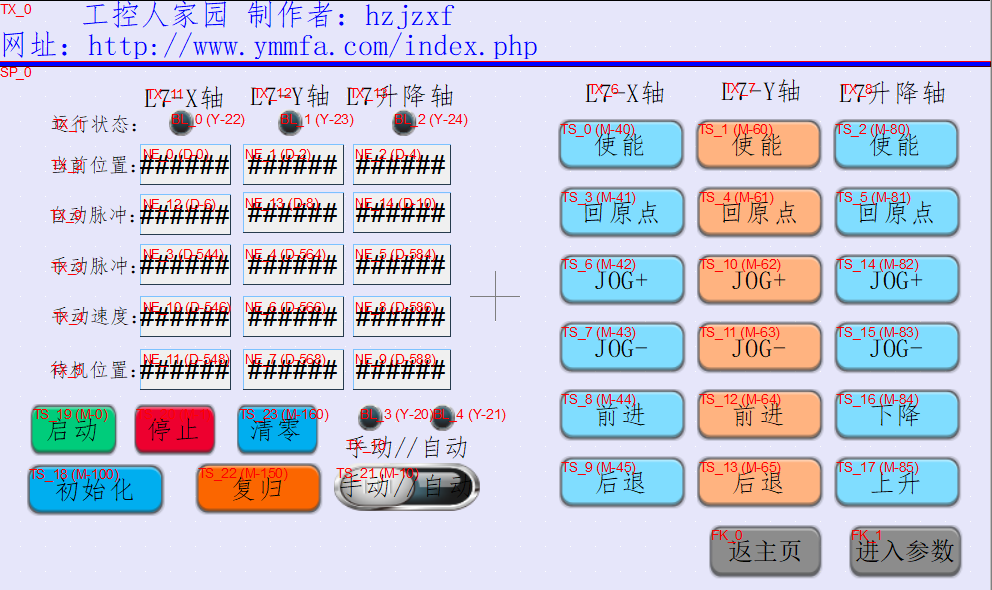 分享一個原創三菱三軸運動控制項目  這個是我通過查找  資料視頻 結合而來 我全網查找了很多觸摸屏 感覺不夠大氣, 大氣的觸摸屏又機型對不上  于是就自己花時間 搞了一個模板 觸摸屏品牌威綸通 型號TK6071IP。  程序是三菱FX3U  主要是我只有這個觸摸屏+plc+圖紙  。   我只寫了手動程序。自動就由大家一起完成。  第一次做比較亂  不是很好。望前輩們多指導 !小輩在此感激不盡!!!