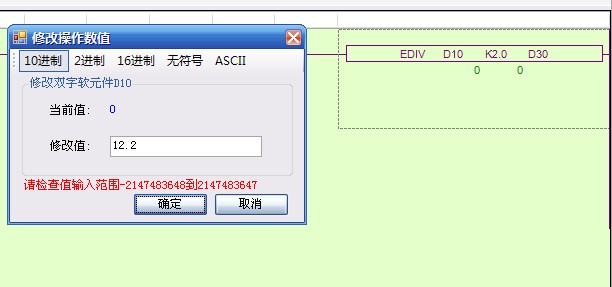 我現在用文本顯示器輸入帶小數的值12.2,給D10,為什么提示不能輸入呢?信捷的PLC在運算小數相乘或是相除時,該怎么寫程序。 |
