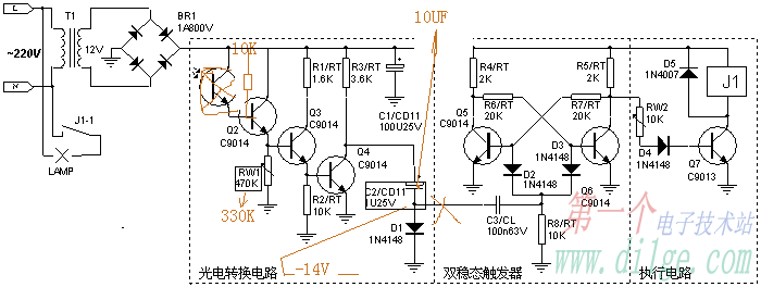 謝謝工控學子的多次指點我把光電電路和雙穩態電路分離開,把光敏電阻用10K電阻替代。并把10K電阻的正電源端懸空以作碰觸。C2換為10UF.未觸發時,C2與D1中間和地之間的電壓為幾毫伏,觸發時電壓為—14V,(RW1調至330K),沒試驗幾次Q4燒毀,換新后,再試驗,幾次,Q4不觸發,因下班,未及查明原因 [attachment=54474]