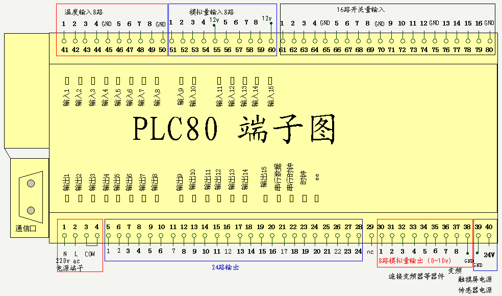 可以把溫度端子或者模擬量輸入端子借過(guò)來(lái),當(dāng)做開(kāi)關(guān)量來(lái)使用 比如把限位開(kāi)關(guān)的一端連接12v電源(55端子),另外一端連接模擬輸入1 在程序中這樣判斷 模擬輸入1的值大于500,輸出。。。動(dòng)作(ON) 模擬輸入1的值小于500,輸出。。。動(dòng)作(OFF) |